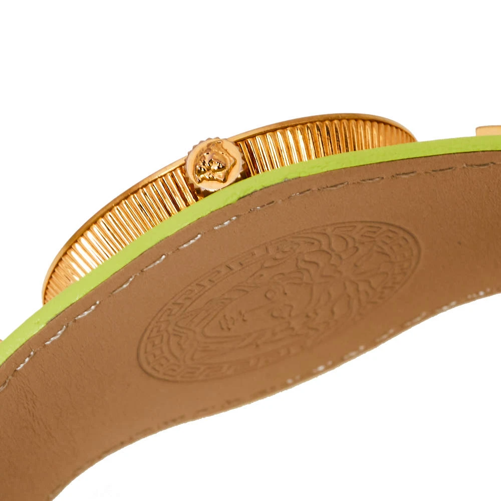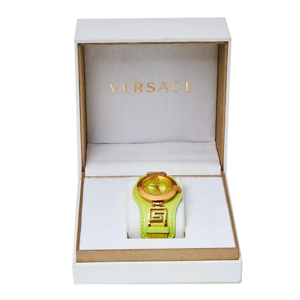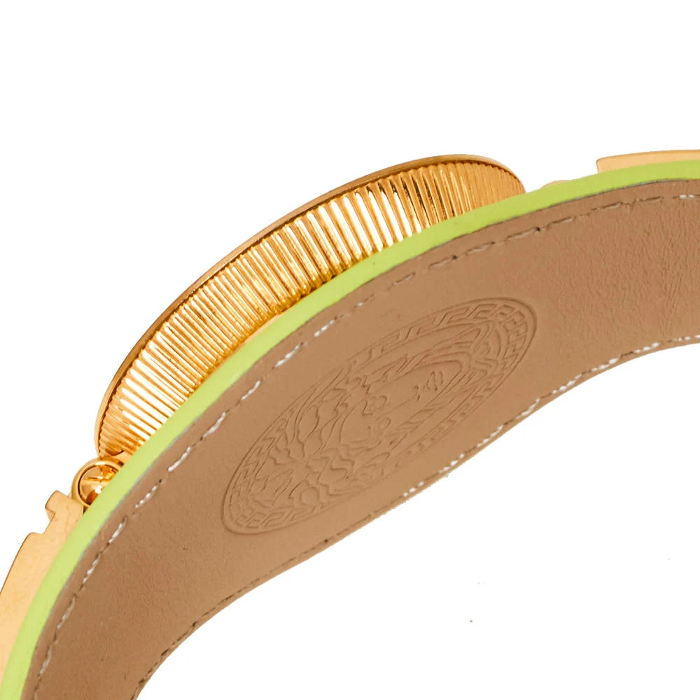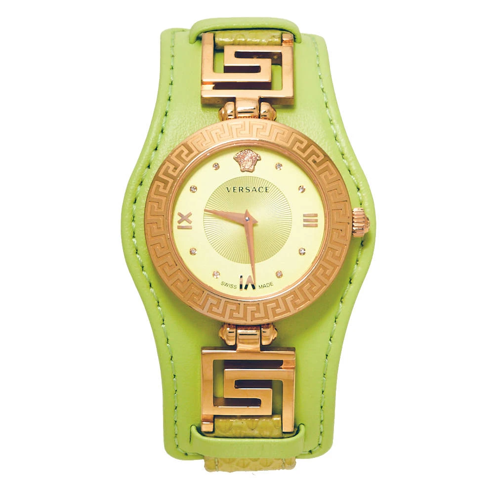 This Versace wristwatch will surely be a fresh addition to your casual style. The watch is made from rose gold-plated stainless steel and set on yellow-green leather. It has signature engravings on the bezel and elegant markers on the dial. The quartz watch can be fastened with the butterfly clasp.