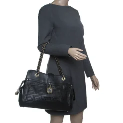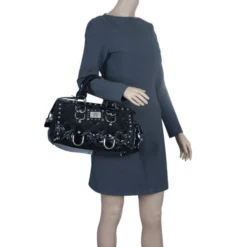Versace Black Signature Nylon And Croc Embossed Patent Leather Flap Compact Wallet For Women