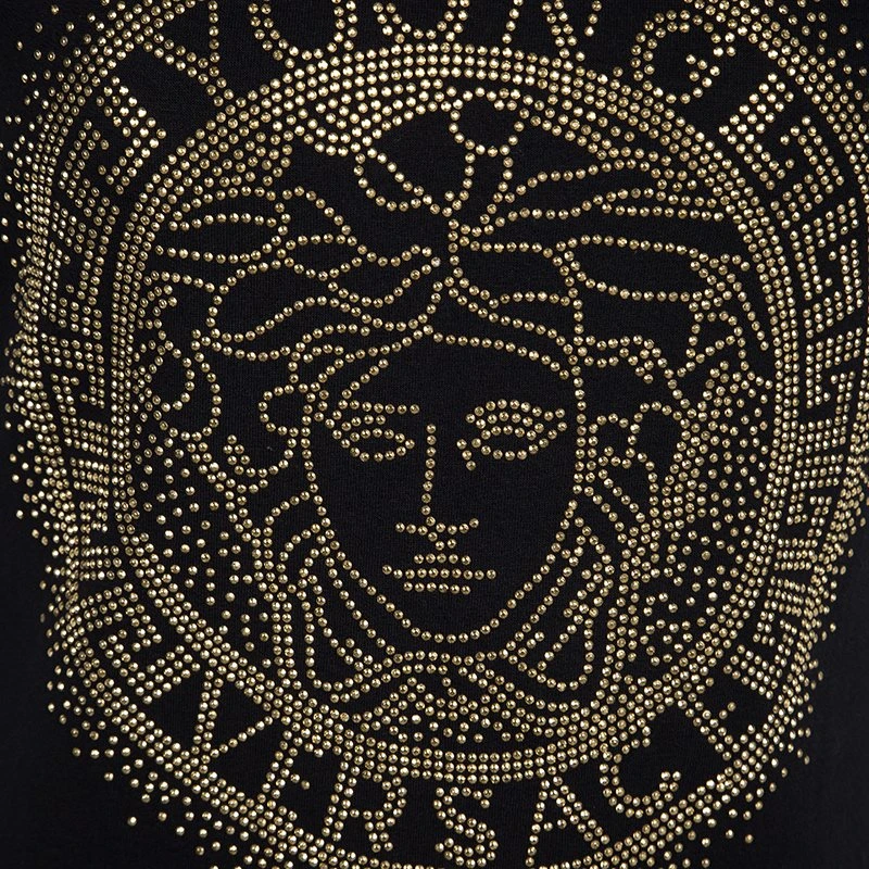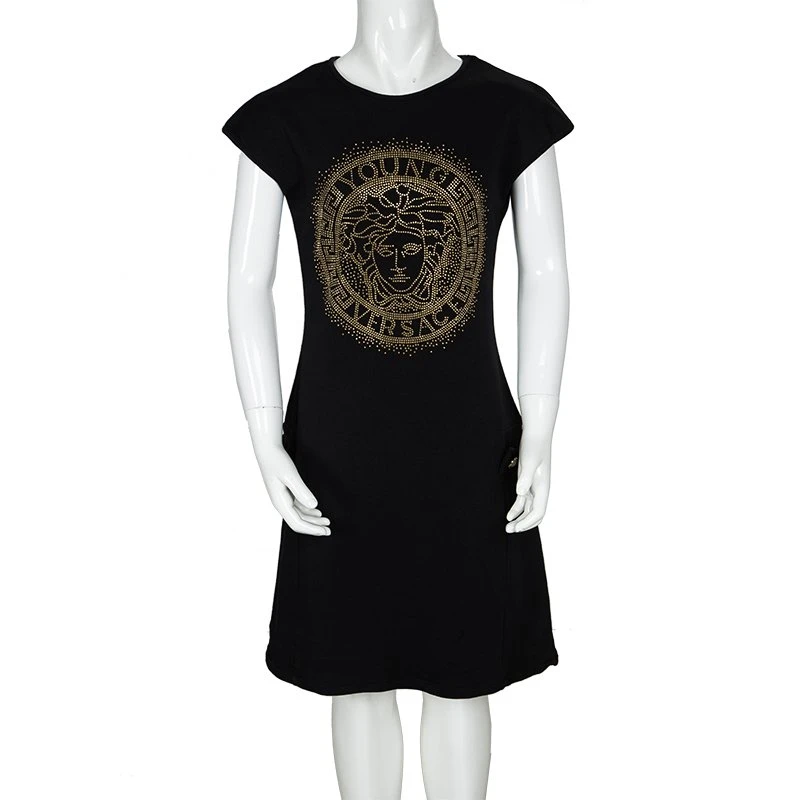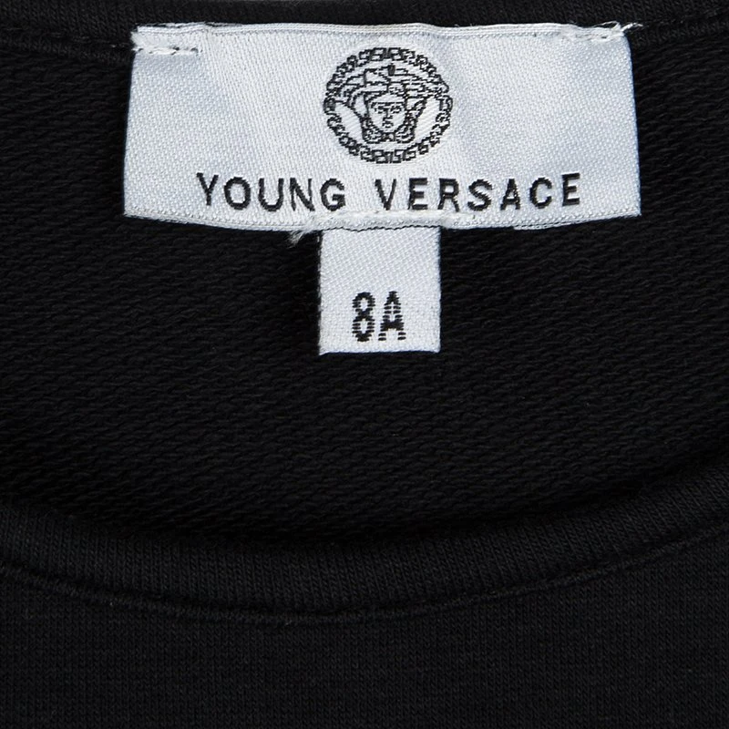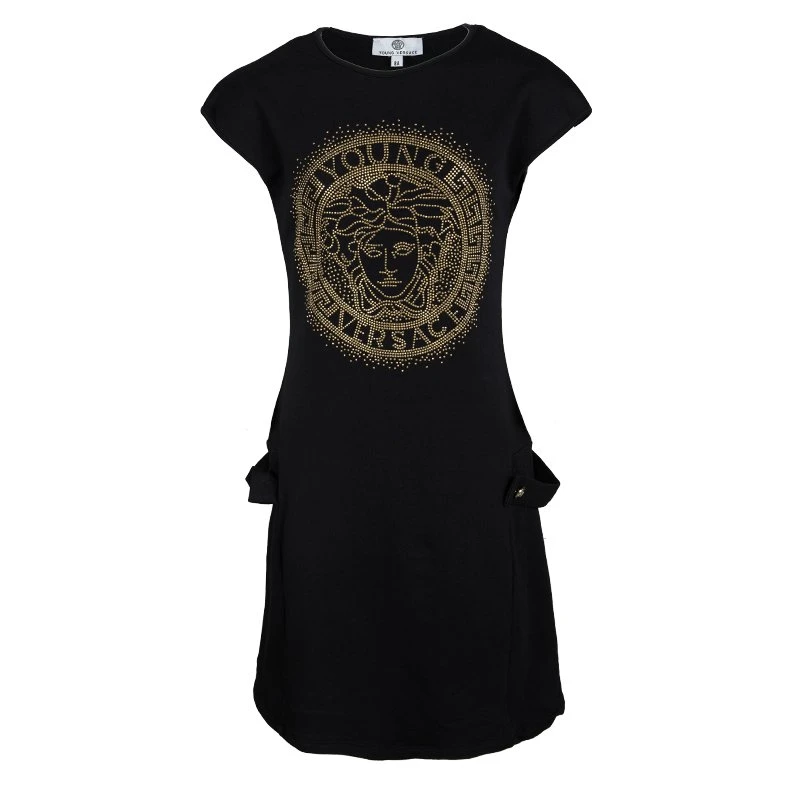 This black dress by Young Versace will be perfect for your little girl’s wardrobe. It has been made from cotton and styled with short sleeves and the famous Medusa logo embellished on the front. Button details on the sides make the dress complete.
