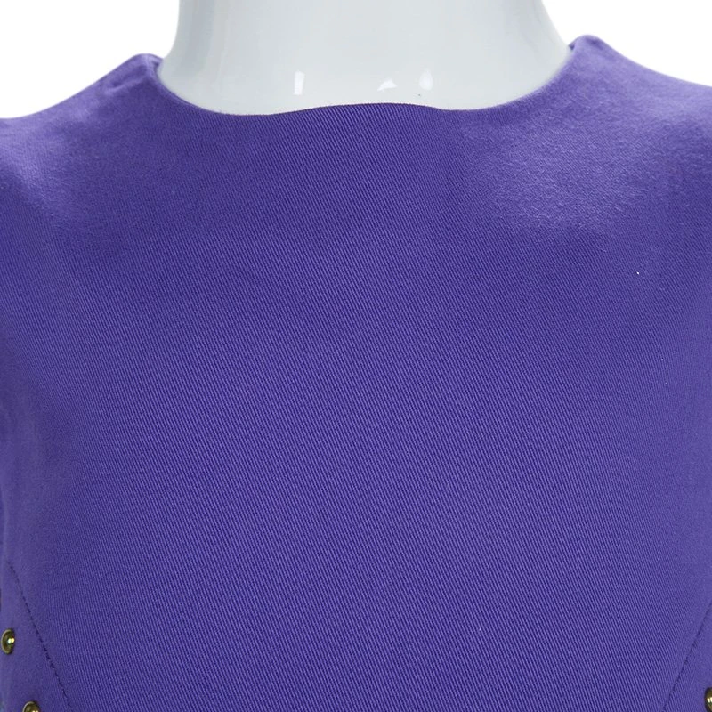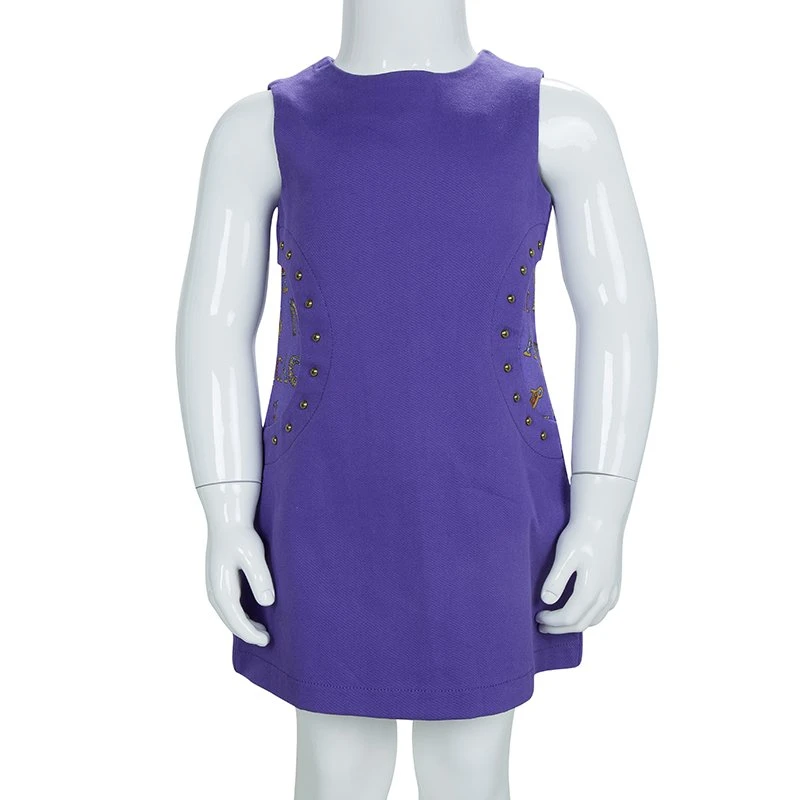 This dress embodies the cutting-edge design that Versace is well-known for. This regal dress has a flawless princess cut with a simple round neck. This adorable piece is sleeveless and it is elevated by golden signature Versace branding along the sides.