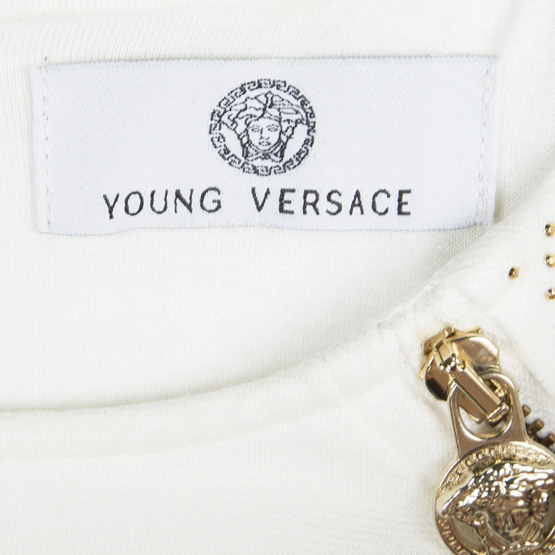 This white dress by Young Versace will be perfect for your little girl’s wardrobe. It has been made from the finest materials and styled with long sleeves and the famous Medusa logo as the zipper pulls. Stud details and zippers make the gorgeous dress complete.